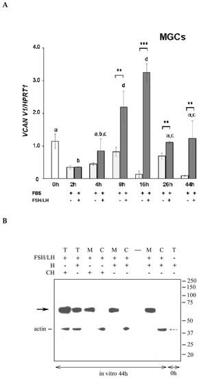 (A) Versican 1 mRNA (VCAN V1) expression in hormone-stimulated mural granulosa cells (MGCs) cultured in vitro. Fifteen small pieces of follicle wall consisting of MGC aggregates were either immediately processed (0 h, white bar) or cultured in 5% FBS-supplemented medium without (light grey bars) or with (grey bars) FSH/LH for the indicated time points. The data shown are representative of three independent experiments. Bars show means ± SEM. Different superscripts indicate statistically significant differences compared to 0 h sample (p < 0.05). Asterisks indicate statistically significant differences between unstimulated and hormone-stimulated MGCs at the same time point (** p < 0.01, *** p < 0.001). (B) Versican fragments containing the neo-epitope DPEAAE in mural granulosa cells (MGCs) after in vitro stimulation with gonadotropins. Porcine MGCs were collected before (0 h) or after 44 h of culture in 5% FBS-supplemented medium in the presence of FSH/LH. Total (T), matrix (M) and cell (C) extracts from collected MGCs were digested with Streptomyces hyaluronidase (H) or chondroitinase ABC (CH) and analyzed by western blot with anti-DPEAAE versican antibody. Actin immunodetection was performed to compare sample loading. A representative blot of three independent experiments is shown.