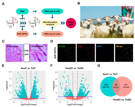 Transcriptomic analysis of overlapping differentially expressed genes (DEGs) from hair follicle (HF) anagen to telogen of Albas cashmere goat. (A) Our experimental workflow. (B) Albas cashmere goats living on the Inner Mongolia Plateau. The red frame shows where cashmere grows. (C) Hematoxylin-eosin (H&E) staining of skin in transverse and longitudinal section. Arrows indicate the primary hair follicle (PHF) and the secondary hair follicle (SHF). (D) Identification of dermal papilla cells of secondary hair follicle (SHF-DPCs) using anti-α smooth muscle actin (α-SMA) (green) antibody and anti-laminin antibody (red). SHF-DPCs were positive for both antibodies and nuclei were marked by 4′,6-diamidino-2-phenylindole (DAPI) staining (blue). (E–F) Volcano plot of all genes in the skin and SHF-DPCs samples of HF anagen and telogen of Albas cashmere goat, showing genes with >2-fold difference and an adjusted p < 0.01 among groups. AnaT, the skin tissue of HF anagen; TelT, the skin tissue of HF telogen, AnaSC, the SHF-DPCs of HF anagen, TelSC, the SHF-DPCs of HF telogen. (G) Venn diagram illustrating the number of overlapping differentially expressed genes (overlapping DEGs) between AnaT vs. TelT and AnaSC vs. TelSC.
