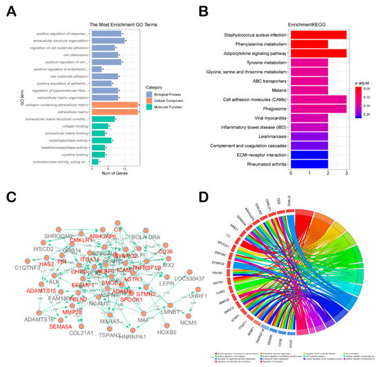 Functional characterization and protein-protein interaction (PPI) analysis of selected DEGs from HF anagen to telogen of Albas cashmere goat. (A) Gene ontology (GO) and (B) encyclopedia of genes and genomes (KEGG) analyses of selected DEGs. (C) PPI network analysis of selected DEGs. The genes in red are those in the Chord plot in Figure 2D. (D) Chord plot depicting the relationship between genes and GO terms of biological process.