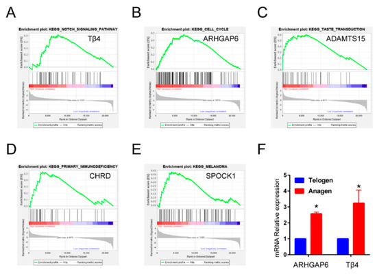 Screening of candidate genes from HF anagen to telogen stages of Albas cashmere goat. (A–E) Gene set enrichment analysis (GSEA) analysis of five candidate genes. (F) The two candidate genes most relevant to hair follicle growth were identified by quantitative real-time PCR (qPCR).