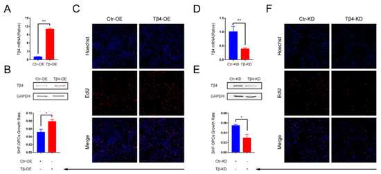 The growth rate of SHF-DPCs was investigated by transfecting Tβ4 overexpression (Tβ4-OE) or Tβ4 knockdown (Tβ4-KD) vector. (A) qPCR and (B) Western blot were used to verify the overexpression efficiency of Tβ4. SPH-DPCs transfected control for Tβ4 overexpression (Ctr-OE) and Tβ4-OE vector (** p < 0.01). (C) The 5-ethynyl-2′-deoxyuridine (EdU) assays revealed that overexpression of Tβ4 significantly increased the growth rate of SPH-DPCs (* p < 0.05). (D) qPCR and (E) Western blot were used to verify the interference efficiency of Tβ4. SPH-DPCs transfected control for Tβ4 knockdown (Ctr-KD) and Tβ4-KD vector (** p < 0.01). (F) EdU assays revealed that downregulation of Tβ4 significantly reduced the growth rate of SPH-DPCs (* p < 0.05) (n.s, not significant).
