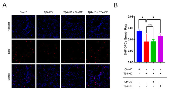 The growth rate of Tβ4-KD-SHF-DPCs was rescued by transfecting Tβ4-OE vector. (A) EdU staining was used to assess the proliferation of SHF-DPCs. (B) The percentage of EdU-positive SHF-DPCs was calculated (* p < 0.05).