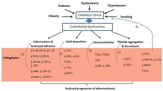 Proposed influence of vildagliptin on atherosclerosis pathophysiology. Note: ↓ = reduction, ↑ = increase, (-) = inhibition, IL-1β = Interleukin 1 beta, IL-8 = Interleukin 8, IL-18 = Interleukin 18, TLR2 = Toll-like receptor 2, TLR4 = Toll-like receptor 4, NF-κB = nuclear factor kappa-light-chain-enhancer of activated B cells, TNF-α = tumor necrosis factor α, CRP = C-reactive protein, pJNK = phosphorylated c-Jun N-terminal kinase, SDF-1α = stromal cell-derived factor 1, ICAM-1 = intercellular adhesion molecule 1, MCP-1 = Monocyte chemoattractant protein-1, TLC = total cholesterol level, VLDL = very low density lipoprotein, LDL = low density lipoprotein, HDL = high density lipoprotein, TGC = triglycerides, MFCF = macrophages foam cells formation, NO = nitric oxide, EDR = endothelial-dependent relaxation, AS – arterial stiffness, SBP = systolic blood pressure, DBP = diastolic blood pressure, aPTT = activated partial thromboplastin time, PAI-1 = plasminogen activator inhibitor-1, ROS = reactive oxygen species, NADPH = Nicotinamide adenine dinucleotide phosphate, LDH = lactate dehydrogenase, AMPK = 5’AMP-activated protein kinase, GSH = glutathione.