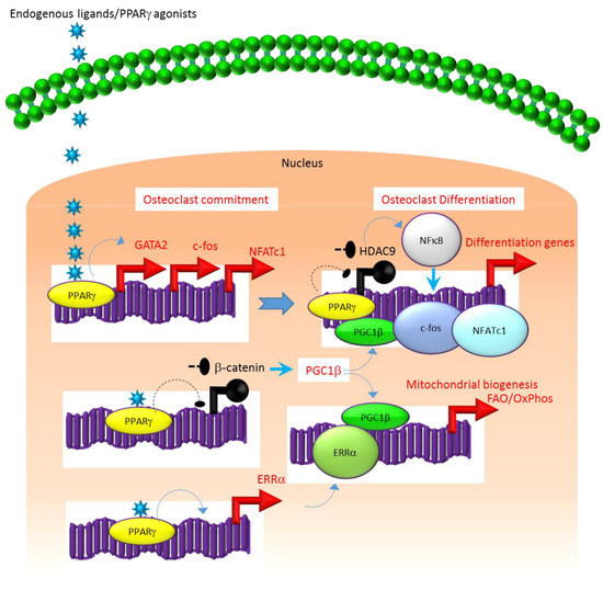 A similar association exists between the molecular mechanisms that regulate the expression and function of PPARγ. For instance, several studies suggest that the class II histone deacetylase 9 (HDAC9) acts in a negative feedback loop with adipogenic transcription factors such as PPARγ to regulate MSC adipogenesis by repressing PPARγ expression in the undifferentiated state of MSCs, whereas under adipogenic conditions, the stimulation of PPARγ expression transrepresses HDAC9 gene expression to permit adipogenic gene expression and differentiation [23,51,52]. In parallel to a role in MSC adipogenesis, it was recently reported that HDAC9-knockout (−/−) mice exhibit low bone mass due to exacerbated osteoclast formation and bone resorption [48]. This phenotype could be rescued by transplanting bone marrow from wild-type (WT) mice to HDAC9 (−/−) mice, while transfer of bone marrow from HDAC9 (−/−) mice to WT mice induced the bone resorption phenotype in the latter [53]. This supports the view that the interplay between PPARγ and HDAC9 is relevant to both bone marrow osteoblastogenic and osteoclastogenic cell populations. Further, it is well-established that PPARγ and Wnt/β-catenin form a negative feedback loop in MSCs such that PPARγ drives adipogenesis by transrepressing HDAC9, cyclin D1 and Notch expression and signaling that ultimately limits osteoblastogenic Wnt/β-catenin signaling [23,54]. Parallel to MSCs, it has been reported that PPARγ also downregulates Wnt/β-catenin signaling in HSCs, which in turn induces peroxisome proliferator-activated receptor-gamma coactivator-1 beta (PGC1β) expression during osteoclastogenesis (Figure 1). Mechanistically, PGC1β exhibits dual roles in HSCs by transactivating c-fos expression which induces osteoclast differentiation and by stimulating mitochondrial biogenesis which supports osteoclast function during bone resorption (Figure 1). As such, PGC1β serves as a common mediator for both PPARγ stimulation of osteoclastogenesis and the resorptive functions of mature osteoclasts [28]. In addition, PPARγ also directly induces the expression of estrogen receptor-related receptor alpha (ERRα) which coordinates with PGC1β to induce mitochondrial biogenesis (Figure 1) that additionally contributes to the PPARγ-mediated activation of mature osteoclasts [28]. Consistent with this, targeted deletion of PGC1β in osteoclastogenic cells by breeding PGC1β-floxed mice with Tie2cre-transgenic mice resulted in the abrogation of PPARγ-induced bone resorption [27,28]. Thus, it is now clear that PPARγ is also an integral component of the core transcriptional machinery of HSCs (Figure 1) and activation of this transcription factor under adipogenic conditions in bone marrow can induce osteoclast differentiation and increase bone resorption in disease conditions.