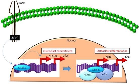 Mechanistically, C/EBPα serves as an osteoclastogenic factor through its ability to bind DNA and activate the transcription of several osteoclast-specific transcription factors including NFATc1 and c-fos (Figure 2) as well as genes required for osteoclast resorptive function including cathepsin K (Ctsk) and osteoclast-specific vacuolar proton pump (Atp6i, also known as Tcirg1; Figure 2) that promotes osteoclast differentiation and function [31]. Promoter activity mapping and chromatin immunoprecipitation (ChIP) assays have identified cis-regulatory elements (CREs) located in the promoter regions and have identified these as direct regulatory targets of C/EBPα [31] (Figure 2). This has been linked to paracrine osteoclastogenic signaling by the observation that the 535IVVY538 (IVVY) motif of RANK stimulates C/EBPα expression, which in turn activates the expression of osteoclastogenic genes (Figure 2) and promotes osteoclast differentiation of HSCs [35]. Consistent with this, mutation of the IVVY motif blocked RANKL stimulation of C/EBPα expression and osteoclast differentiation of HSCs [35]. It has been reported that C/EBPα has a substantial and wide-ranging role throughout multiple phases of osteoclast development and function. For example, overexpression of C/EBPα alone was reported to be sufficient to promote osteoclast lineage commitment of HSCs even in the absence of RANKL stimulation [31,35]. Furthermore, ectopic expression of C/EBPα in differentiated macrophages reprogrammed the cells to fuse and convert into osteoclast-like cells with a marked induction of several osteoclast marker genes including TRAP, Ctsk, NFATc1, c-fos, MMP9, TRAF6 and RANK coincident with a downregulation of the macrophage marker F4/80 [31]. Consistent with these findings, C/EBPα+/− and C/EBPα−/− mice were reported to exhibit a gene dosage-dependent loss of osteoclast numbers and an osteopetrosis phenotype [31]. In addition to a role in osteoclast lineage commitment and maturation, C/EBPα is also critical for osteoclast function as it is essential to stimulate the extracellular acidification process and to maintain osteoclast survival during resorption [30]. Together, these studies provide evidence that C/EBPα is an osteoclastogenic transcription factor that can effectively induce osteoclast differentiation and function (Figure 2).