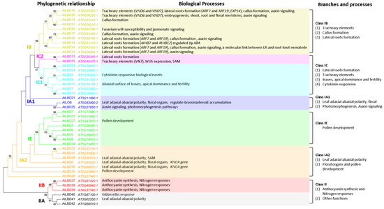 Arabidopsis, as a model plant, has the most in-depth studies on the functions of LBD genes. In Arabidopsis, the LBD gene family comprises 43 members, and at least 25 of them have been cloned and functionally characterized [3,13,47,48,49]. Here, we summarize the recent progress on the identification and characterization of LBD proteins in Arabidopsis and, combining the reported LBD gene functions with the phylogenetic results of Arabidopsis LBD family members, further investigate the substantial relationship between phylogenetic homology and functional similarity of LBD family genes.