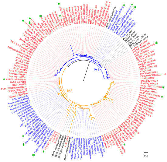 Phylogeny of LBD proteins from Class IA in 18 species. This phylogeny was reconstructed using Class IA LBD proteins identified in Figure 1 and according to the same method described in Figure 1 legend. “*” means functionally characterized LBD protein in Table 2 (Gene ID is in brackets for LBD proteins of 18 species, species name is in square brackets for LBD proteins of other species). LBD proteins of eudicots, monocots, and other plant species are marked in red, blue and black, respectively. Branch color corresponds to that in Figure 1.