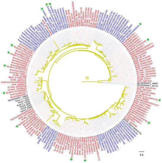 Phylogeny of LBD proteins from Class IB in 18 species. This phylogeny was reconstructed using Class IB LBD proteins identified in Figure 1 and according to the same method described in Figure 1 legend. “*” means functionally characterized LBD protein in Table 2 (Gene ID is in brackets for LBD proteins of 18 species, species name is in square brackets for LBD proteins of other species). LBD proteins of eudicots, monocots, and other plant species are marked in red, blue and black, respectively. Branch color corresponds to that in Figure 1.