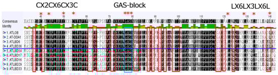 Sequence comparison of selected Class IA and Class IB LBD proteins. Red frame indicates conserved amino acid residue within each clade. “*” indicates conserved amino acid residues across different clades.