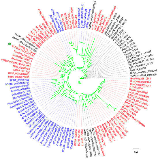 Among Class IE LBD members, only Arabidopsis AtLBD27 was functionally studied (Figure 2, Table 2). AtLBD27 plays an essential role in pollen development [68,69,112]. Flowering plants have a complex life cycle that involves a switch between a multicellular (2n) sporophyte generation and a (n) gametophyte generation. AtLBD27 is required for correct initiation and orientation of the polarized microspore’s asymmetric division to generate bicellular pollen, as the lbd27 mutant produces aberrant microspores with increased cell expansion, delayed mitosis entry and altered nuclear division orientation phenotypes. [112,113]. AtLBD10, which belongs to Class IA, can also affect the pollen development as mentioned above. The lbd10 or lbd27 single mutant had aborted pollen grains at a ratio of 12.7% and 70% respectively, whereas all pollens in the lbd10 lbd27 double mutants were aborted, indicating that both AtLBD10 and AtLBD27 are essential for Arabidopsis pollen development [68]. Figure 7 shows a more detailed phylogenetic tree for Class IE clade LBD proteins.