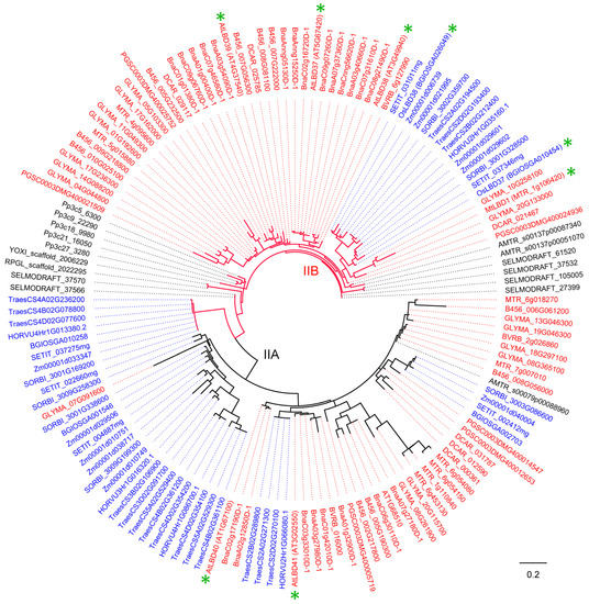 For other plants, three Class IIB LBD proteins were identified, including two from rice and one from Medicago (Figure 8, Table 2). In rice, the metabolomic and transcriptomic analysis on OsLBD37 overexpressing plants revealed that OsLBD37 is also associated with nitrogen metabolism [25]. OsLBD37 and OsLBD38, two homologs of Arabidopsis AtLBD37, serve as negative regulators of rice heading date [26]. Overexpression of OsLBD37 and OsLBD38 delayed heading date and increased yield via downregulating the florigen genes Hd3a and RFT1 and the key regulator of heading date Ehd1 [26]. In Medicago, homeobox 1 (HB1, belonging to the HD-Zip family) directly binds to a CAATAATTG cis-element present in the promoter of LBD1 to regulate the LR emergence by auxin [58]. Figure 8 shows a more detailed phylogenetic tree for Class II clade LBD proteins.