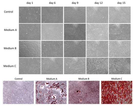 The visualization of calcium phosphates and carbonates, which are indicators of functional osteoblasts, was conducted using Alizarin Red S staining. We observed mineralized nodules in all three osteoinductive media (Figure 1). However, the calcium deposit production varied in each of them. The same results, as observed with a morphological comparison of the cytological changes, were proven even when using deposit staining (Figure 1). Medium C showed the strongest calcium mineral production. In addition, we observed some calcium production in Medium A. On the other hand, only a few mineral calcium nodules were stained when Medium B was used.