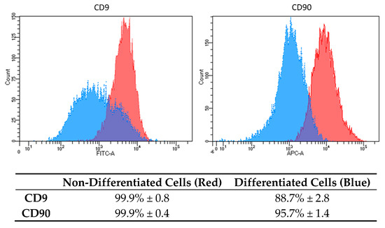 Surface markers expression characteristics in DPSCs differentiated into osteoblasts. Histograms show differences in the expression level of two specific CD markers (CD9 and CD90) in non-differentiated cells (red color) and in differentiated cells (blue color). Results are presented as mean percentage (%) of positivity in the total population ± standard deviation (SD).