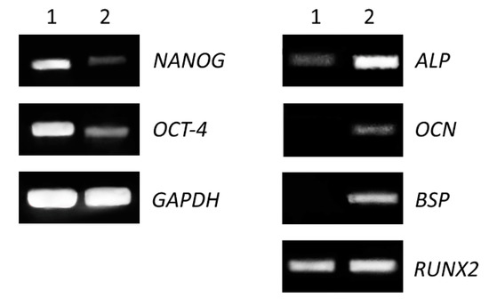 Comparison of expression level of stem cells and osteogenic markers. Non-differentiated (1) and differentiated (2) cells were seeded in 25 cm2 flasks for 15 days. Total RNA was isolated and expression of pluripotent genes (left panel), transcriptional factor (NANOG) and octamer-binding transcription factor 4 (OCT-4), as well as osteogenic genes (right panel) alkaline phosphatase (ALP), bone sialoprotein (BSP), osteocalcin (OCN) and runt-related transcription factor 2 (RUNX2) were analyzed by RT-PCR. The housekeeping gene glyceraldehyde 3-phosphate dehydrogenase (GAPDH) was used as an internal control.