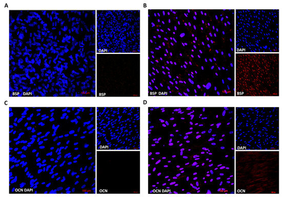 The osteogenic differentiation of DPSCs requires the activity of specific transcription factors, which bind to the DNA of stem cells and regulate their gene expression during bone formation [24]. These transcription factors are expressed and functional at distinct time points during differentiation, which refer to various developmental stages of the osteoblast lineage [23,25]. We proved that the expression of alkaline phosphatase (ALP), bone sialoprotein (BSP) and osteocalcin (OCN) genes increased during the differentiation of DPSCs (Figure 3, right panel). Moreover, increased protein expression was analyzed by fluorescent microscopy, and both proteins (BSP and OCN) were detected only in osteogenic-differentiated cells compared to control (Figure 4).