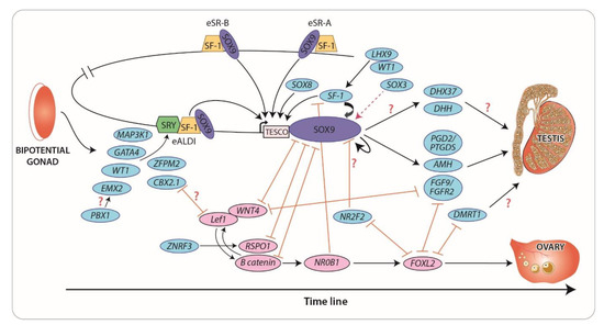 Timeline of genes involved in gonadal development. Genes shown are known to play a role in sex-specific gonadal development in human and mice. Testis-related genes (blue) and ovary-related genes (pink) represent a regulatory pathway which leads to Sertoli and granulosa cell development, respectively. The orange arrows represent an antagonistic action. Interactions that are postulated but unproven are indicated with (?). The ectopic gonadal expression of Sox3 (represented by red dotted line) induces testis differentiation by upregulating Sox9 in a similar way to Sry.