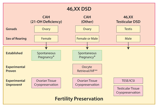- Kalra, R.; Cameron, M.; Stern, C. Female fertility preservation in DSD. Best Pract. Res. Clin. Endocrinol. Metab. 2019, 33, 101289. [Google Scholar] [CrossRef] [PubMed]