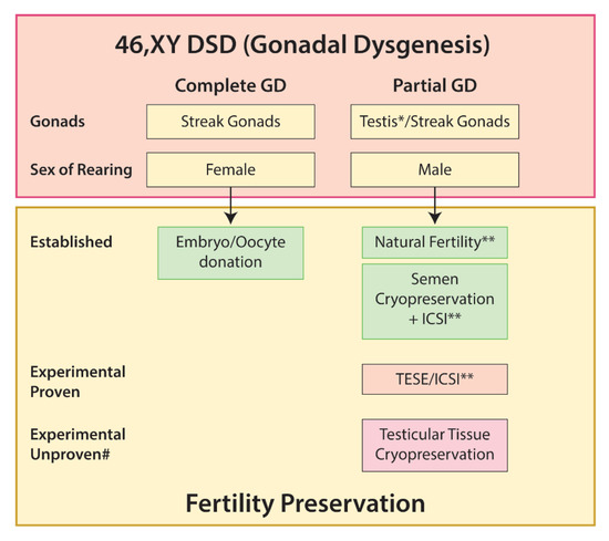 Options for fertility preservation in 46,XX/46,XY and 46X/46,XY DSD are summarized in Figure 3.