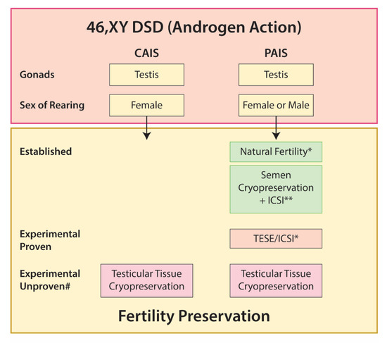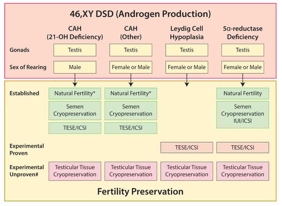 - Islam, R.; Lane, S.; Williams, S.A.; Becker, C.M.; Conway, G.S.; Creighton, S.M. Establishing reproductive potential and advances in fertility preservation techniques for XY individuals with differences in sex development. Clin. Endocrinol. (Oxf.) 2019, 91, 237–244. [Google Scholar] [CrossRef]