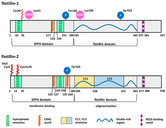 Flotillin-1 and -2 have the same domain architecture and show sequence identity reaching about 50% for the human proteins [58,59]. They comprise an SPFH domain starting several amino acids downstream of the N-terminus and encompassing about 180 amino acids and an adjacent flotillin domain similar in size. Several distinct lipid- and protein-binding motifs have also been identified in flotillins [59,60,61,62], as shown in Figure 1. Owing to the presence of the SPFH domain, flotillins belong to the SPFH superfamily of proteins named after stomatin, prohibitin, flotillin, and HflC/K. Structurally related proteins with moderate sequence homology to human flotillins are found in bacteria, plants, and fungi, suggesting evolutionarily conserved functions [59,63,64,65].