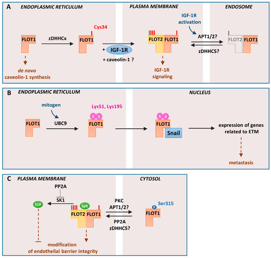 Cellular localization and functioning of flotillin-1 regulated by S-palmitoylation, sumoylation, and serine phosphorylation: (A). Trafficking from the endoplasmic reticulum to the plasma membrane. Newly synthesized flotillin-1 is S-palmitoylated by unidentified zDHHC (zDHHCx). This acylation determines trafficking of flotillin-1 to the plasma membrane concomitant with IGF-1 receptor (IGF-1R) trafficking. The exit of S-palmitoylated flotillin-1 can also mediate efflux of caveolin-1 from the endoplasmic reticulum protecting the endoplasmic reticulum from stress, which otherwise would inhibit the synthesis of caveolin-1. At the plasma membrane, flotillin-1 forms hetero-oligomers with flotillin-2 and, upon activation of IGF-1R, undergoes depalmitoylation/repalmitoylation required for prolonged receptor signaling. zDHHC5 and protein depalmitoylases—acyl-protein thioesterase-1/2 (APT1/2) or ABHD17 proteins—probably catalyze these reactions. Since the S-palmitoylation of flotillin-1 is required for its plasma membrane localization, depalmitoylation can be linked with its cycling between the plasma membrane and endosomes either alone or with flotillin-2. (B) Regulation of gene expression in metastatic prostate cancer cells: In these cells, non-palmitoylated flotillin-1 in the endoplasmic reticulum undergoes sumoylation at Lys51 and Lys159 with SUMO-2/3. The reaction is catalyzed by the E2 ligase UBC9. Sumoylated flotillin-1 translocates to the nucleus, binds Snail transcription factor, and protects it from proteasomal degradation. This triggers expression of genes related to ETM transition and metastasis. (C) Endothelial barrier regulation: In endothelial cells, flotillin-1 can be phosphorylated at Ser315 by protein kinase C (PKC). The phosphorylated and probably depalmitoylated flotillin-1 localizes to the cytosol. Subsequent dephosphorylation of flotillin-1 by PP2A allows its plasma membrane association, likely correlated with S-palmitoylation catalyzed by zDHHC5. PP2A-dephosphorylated flotillin-1 contributes to endothelial barrier integrity and angiogenesis. PP2A also inhibits the activity of SK1 which catalyzes phosphorylation of sphingosine, a lipid bound by flotillins. P, phosphorylation; S, sumoylation; Sph, sphingosine. N-myristoylation and S-palmitoylation are marked by green and red bars, respectively.