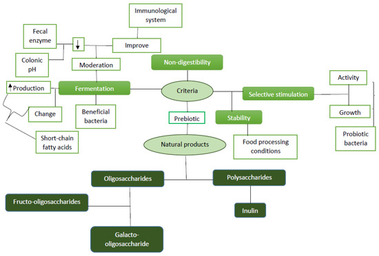 Prebiotics [62,63,64,65,66] are a special form of dietary fiber with health benefits, which invoke alterations in the host microbial ecosystem, not only in the gut, via their selective administration by live host microbes [67]. Food ingredients like prebiotics are classified on the basis of some principles, such as resistance to digestion in upper alimentary tract, selective stimulation of probiotic growth, beneficial health effects in the host, stability in different conditions of food/feed processing, and fermentation process through intestinal microbiota. They are found in various sources, including some non-digestible oligosaccharides, non-digestible carbohydrates, yacon, unrefined wheat, unrefined barley, soybeans, raw oats, breast milk, and inulin sources (e.g., chicory roots and Jerusalem artichoke) [68]. Some compounds found in prebiotics are soya-oligosaccharide, xylo-oligosaccharide, pyrodextrins, gluco-oligosaccharide, lactulose, malto-oligosaccharide, galactans (galacto-oligosaccharide (GOS)), oligofructose, isomalto-oligosaccharide (IOS), fructans (FOS and inulin), mannan-oligosaccharide (MOS), lactitol, and non-starch polysaccharides (NSP). Figure 1 gives an overview of prebiotics.