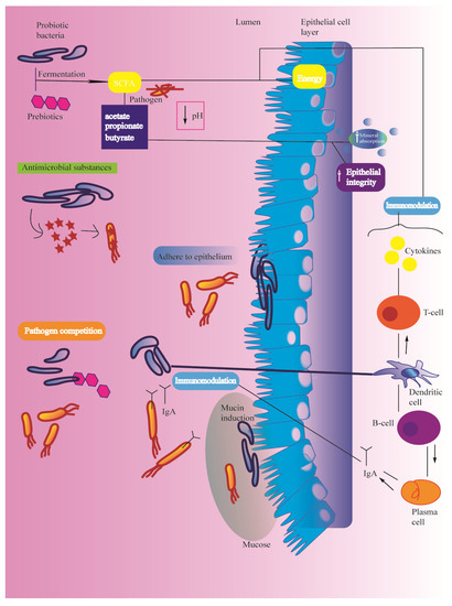 Several mechanisms are involved in the bioactivity of prebiotics and probiotics [69,70], as described in Figure 2.