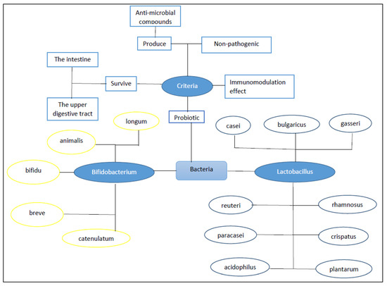 The FAO (Food and Agriculture Organization) and WHO (World Health Organization) have defined probiotics as non-pathogenic living microorganisms that ensure host health if used properly in foods or as dietary supplements [71,72]. Probiotics come from different sources, such as various natural environments, human gut microbiota, and foods. The main properties of probiotics like the ability to survive through the gastrointestinal tract, the resistance against bile and gastric acidity, and the stimulation of the activity of bile salt hydrolase, promote health benefits to the host [68,73,74,75,76,77,78,79,80,81]. The count of probiotic bacteria (colony-forming units (CFU)/g) in probiotic-containing products differ among the countries; for example, 107 CFU/g in the USA and 109 CFU/g in Canada. The effective dose generally contains >106–108 CFU/g or >108–1010 CFU/d of live probiotic bacteria [82,83]. Most probiotics are found in Gram-positive bacteria, including Streptococcus, Bacillus, Lactobacillus, Enterococcus, and Pediococcus. The probiotics can also include fungal and yeast species such as Saccharomyces cerevisiae and Kluyveromyces. Only some microorganisms such as Lactobacillus spp., Bifidobacterium spp., and Lactococcus are known as generally recognized as safe (GRAS) despite the existence of diverse microorganisms which can act as probiotics with health benefits [84,85,86]. Figure 3 gives an overview of probiotics.