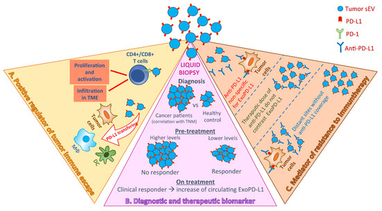 Summary of the biological and clinical meaning of tumor small extracellular vesicles (sEVs) carrying programmed death-1 (PD-1). Exosomal PD-L1 (ExoPD-L1) is described to play a direct role in altering immune surveillance (A), to have clinical relevance as a non-invasive tumor and immune cell biomarker in cancer (B), and it is considered as a potential mediator of resistance to current immunotherapeutic strategies (C).