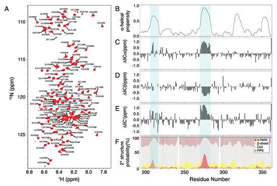 The chemical shift assignments for the IDRs of Musashi-1 (residues 194–362; BMRB access number: 50204) are shown in Figure 2A (pH 5.5, 283 K). The protein is prone to aggregation and proline-rich (~12% in the sequence), so a specific assignment strategy was used, as described in the Material and Methods section and the Supplementary Information. Although the PASTA algorithm [40] predicts four α-helices based on the primary sequence (Figure 2B), secondary chemical shift analysis indicates that just two regions, residues ~208–218 and ~270–284, form transient α-helices (Figure 2C–E), with populations (predicted using the δ2D algorithm [41] derived from the molecular dynamics simulation and experimental observations of conformational equilibrium of multiple states, using Cα, Cβ, C’, HN, and NH chemical shifts) of 28% and 45% at most (Figure 2F).