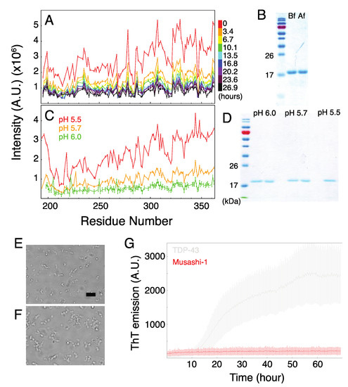 Analysis of the non-cross-beta Musashi-1 oligomers formed at lower pHs and after prolonged incubation. (A) Decrease in NMR HSQC peak intensity as a function of time. Data collected at 303 K, pH 5.5. (B) SDS-PAGE analysis of protein integrity before (Bf) and after (Af) the one-day NMR experiments, whose results are shown in panel A. (C) NMR HSQC peak intensities at 283 K and pH 5.5, 5.7, and 6.0 and 283 K. (D) SDS-PAGE analyses of the samples prepared at pH 5.5, 5.7, and 6.0. (E,F) Micrographs of samples (E) incubated at 303 K for 24 h at pH 5.5 or (F) freshly prepared at pH 6. Scale bar = 10 µm. (G) ThT assay of Musashi-1 (red) and the C-terminal domain of TDP-43 (control experiment; gray).