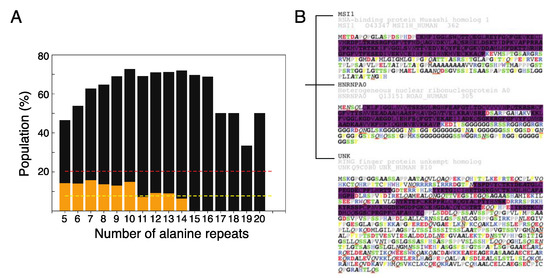 Among the 20,000+ human protein sequences in the UniProtKB/Swiss-Prot database, gene ontology (GO) annotations indicate that about 20.3% (listed in the Supporting Information) are RNA-related (including RNA polymerases associated functions), and 7.7% are specifically related to “RNA binding”. The proportion of proteins with polyalanine tracts (5–20 repeats) that are RNA-related is much higher; for example, more than 60% of those with 7–16 repeats are associated to RNA-related function. Only considering proteins tagged as “RNA binding”, the proportion of proteins with stretches of 5–10 alanine repeats can be twice as high as in the database as a whole (Figure 5A; Supplementary Table S2). There is, therefore, an association between the presence of polyalanine tracts and RNA-related function.