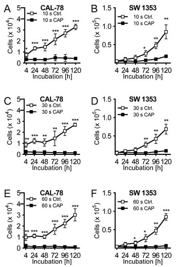 Cell culture medium was treated for 10, 30, and 60 s, and immediately applied to untreated CS cells seeded 24 h before. Cell culture medium activated with CAP for 10 s exhibited a rather modest antiproliferative effect after 120 h of incubation (CAL-78: 63 ± 7%, p = 0.002; SW 1353: 24 ± 6%, p < 0.001; Figure 2A,B). This was more pronounced when the cell culture medium was activated for 30 s (Figure 2C,D) and finally achieved a similarly strong effect after 60 s of activation as in the direct CAP treatment of the cells (Figure 2E,F).