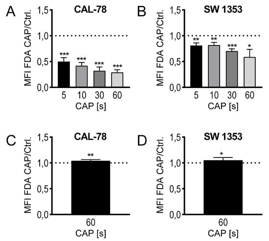 Fluorescein diacetate (FDA) uptake assay (A,B): the cell lines CAL-78 (A) and SW1353 (B) were treated with 5, 10, 30, or 60 s CAP or carrier gas argon and stained with FDA and ethidium bromide (EtBr). Afterwards, the flow cytometric analysis of single living cells was performed. Mean fluorescence intensity (MFI) of CAP-treated cells were normalized to the MFI of argon-treated cells. FDA-release assay (C,D): the cell lines CAL-78 (C) and SW1353 (D) were incubated with FDA, washed, and treated with 60 s CAP or carrier gas argon. After an incubation time of 20 min, the cell-free supernatant was analyzed in a fluorescence plate reader (excitation: 300 nm; emission 525 nm). MFI of the supernatant of CAP-treated cells normalized to the MFI of the supernatant of argon-treated cells. Data are given as mean ± SD; significant differences are indicated as follows: * p ≤ 0.05, ** p ≤ 0.01, *** p ≤ 0.001.