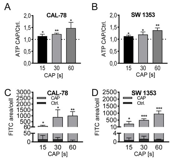 The detection of extracellular ATP confirmed the release of low molecular weight compounds after CAP treatment. In a treatment time-dependent manner, endogenously synthesized ATP was released into the cell culture supernatant and could be detected after only 3 min of incubation. The extracellular ATP concentration increased continuously with prolonged treatment times of 15, 30, and 60 s and achieved relative concentrations of 147% ± 22% (p = 0.033, CAL-78) and 136% ± 8% (p = 0.012, SW1353) of the control preparations after 60 s of CAP treatment (Figure 4A,B).