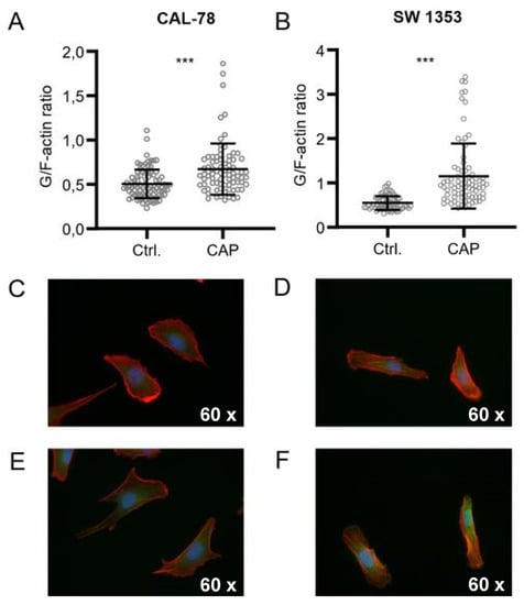 Further microscopic analyses demonstrated that the actin composition of the cytoskeleton could be affected by CAP treatment, although the effects were inconsistent (Figure 5). The G-/F-actin ratio was significantly increased in CAL-78 (133%, p < 0.001) and SW1353 (209%, p < 0.001) cells after 5 s (CAL-78) and 10 s (SW1353) CAP exposure.