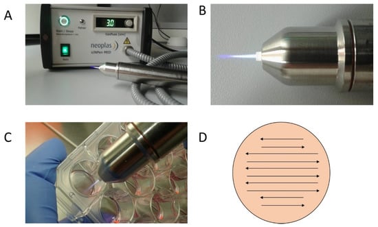 The CAP device kINPen MED from neoplas tools (Greifswald, Germany) was used in this work (Figure 6). This atmospheric pressure plasma jet was operated with argon as carrier gas at a flow rate of 3 standard liters per minute. It creates a 9–13 mm long plasma flame with a temperature below 40 °C. The sinusoidal operating frequency is approximately 1 MHz. The high voltage used for CAP generation is in the range of 2–3 kV. The plasma-dissipated power was specified at approximately 1 W, and the device input power at approximately 20 W. The kINPen is a CE-certified (Conformité Européenne-certification mark within the European Economic Area) product []. The cell treatment with the kINPen jet was performed manually. The distance was chosen so that the tip of the flame only reached the surface of the cell suspension or liquid. The flame was meandered through the liquid as shown in Figure 6B–D.