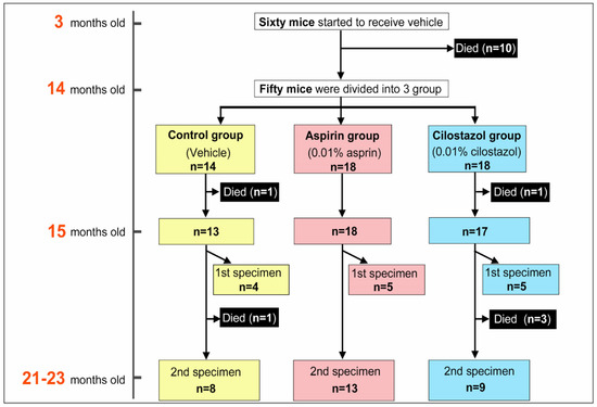 As a CAA animal model, we used female B6, SJL-Tg 2576Kha (APPSWE) transgenic mice (Tg2576 mice: Taonic Bioscience, Inc., NY, USA). The Tg2576 mice were housed in a room with a 12-h light/dark cycle (light on at 7:00 a.m.) with access to food and water ad libitum. A flow diagram of the study schedule and grouping is shown in Figure 1. Sixty Tg2576 mice aged 3 months were started on standard pelleted chow (vehicle). Eleven months after, mice aged 14 months were divided into three groups with adjustment for body weight: control group (mice fed with standard pelleted chow only), aspirin group (mice fed with the pelleted chow containing 0.01% aspirin), and cilostazol group (mice were fed with pelleted chow containing 0.01% cilostazol). The dose setting for each drug is described in the next section (please see 4.3, Drugs). The Tg2576 mice were randomly assigned to each group (in considering drug-associated death, we a priori planned to allocate more mice to the aspirin or the cilostazol group).