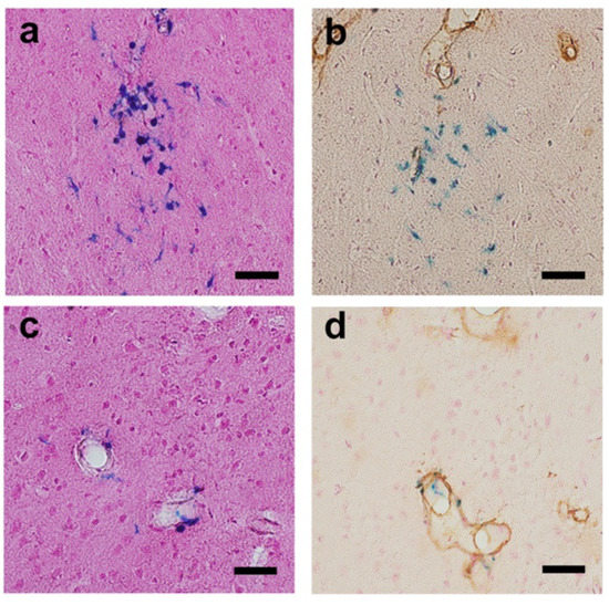 Representative images of cerebral micro-hemorrhage findings (a, b, Perls’s Berlin blue stain with Nuclear Fast Red (Kernechtrot stain solution)); b, d, double-labeled for amyloid (brown) and hemosiderin (blue)). (a) Clusters of hemosiderin staining are shown in the brain parenchyma (cortex at 1.35 mm behind Bregma). (b) In an adjacent section to a, some of them are in contact with amyloid-β (Aβ)-positive vessels. (c) Localized hemosiderin shown around the vessel wall (cortex at 0.85 mm behind Bregma). (d) In an adjacent section to c, localized bleeding to amyloid-laden vessels is shown. Scale bars indicate 10 µm.