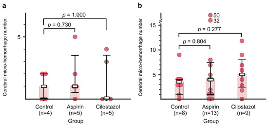The number of cerebral micro-hemorrhages in the control, aspirin, and cilostazol groups evaluated at 15 months (a) and 21–23 months (b). Light-red-colored bar graphs indicate median. Boxes and bars indicate median and interquartile range, respectively. Red circles represent the number of cerebral micro-hemorrhages of each mouse. The numbers next to the red circles indicate the number of cerebral micro-hemorrhages, which are out of range of the vertical axis scale in two mice (b, Aspirin group).