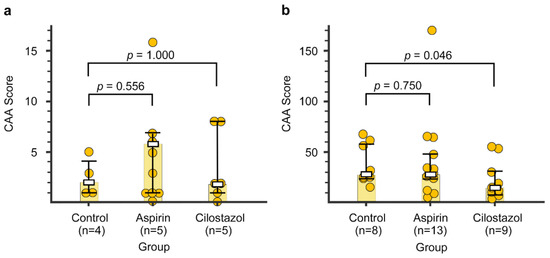 The representative images of CAA burden are shown in Figure 5. In the first specimens, there were no differences in the CAA score between the control group (median, IQR: 2, 1–4) and the aspirin group (6, 1–7) or the cilostazol group (2, 1–8) (p = 0.556 and p = 1.000, Mann–Whitney U test: Figure 6a). In the second specimens, there was no difference (p = 0.750, Mann–Whitney U test) in the CAA score between the control group (28.5, 24.5–58) and the aspirin group (28, 23–47). Even after an outlier of the CAA score in the aspirin group (168) was excluded, non-significant results still remained (median, IQR: the aspirin group, 27, 18.5–40.5, p = 0.521, Mann–Whitney U test). In contrast, the CAA score of the cilostazol group (14, 11–31) was significantly lower in the control group (p = 0.046, Mann–Whitney U test: Figure 6b).