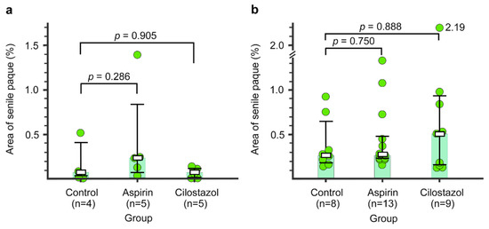 The percent area of senile plaque in the control, aspirin, and cilostazol groups evaluated at 15 months (a) and 21–23 months (b). Light-green-colored bar graphs indicate median. Boxes and bars indicate median and interquartile range, respectively. Green circles represent the value of percent area of senile plaque of each mouse. The numbers next to the green circle (2.19) indicate percent area of senile plaque out of the range of the vertical axis scale (b, Cilostazol group).