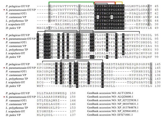 In invertebrates, OT or VP-like peptide has been widely identified among various phyla, while the co-occurrence of the two in the same species had never been demonstrated. In crustaceans, the OT/VP-like peptides have been reported in the blue swimming crab Portunus pelagicus, the water flea Daphnia pulex, the giant freshwater prawn Macrobrachium rosenbergii and the mud crab Scylla paramamosain, but lack of function tests [19,20,21,22]. Though the functional expression in cells and characterisation of OT/VP-like receptor have been investigated in mollusks, insects and nematodes, so far it isn’t studied in crustaceans [20,23,24,25].