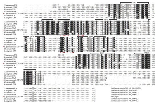 Multiple sequence alignment of deduced preprohormone sequences from SpOT/VP-like receptor and other OT/VPRs. Numbers of amino acid are listed on the right side. Seven transmembrane domains are shown on black semi-frames.