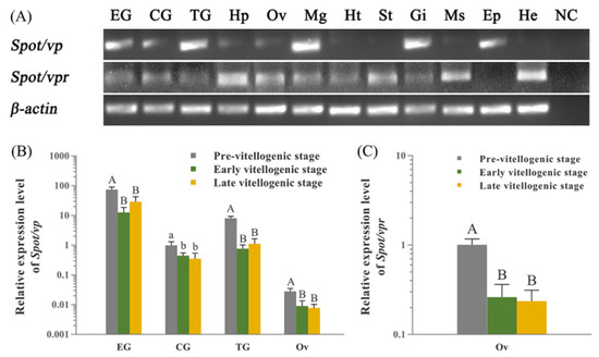 Expression analysis of Spot/vp and Spot/vpr-like transcripts in S. paramamosain. (A) Tissue distribution of Spot/vp and Spot/vpr-like transcripts in 12 tissues of early vitellogenic stage S. paramamosain: EG, eyestalk ganglion; CG, cerebral ganglion; TG, thoracic ganglion; Hp, hepatopancreas; Ov, ovary; Mg, midgut; Ht, heart; St, stomach; Gi, gill; Ms, muscle; Ep, epidermis; He, hemocyte; NC, negative control (a PCR reaction performed without adding template). (B) Expression analysis of Spot/vp-like transcripts at different vitellogenic stages in EG, CG, TG and Ov. (C) Expression analysis of Spot/vpr-like transcripts at different vitellogenic stages in Ov. β-actin as the reference gene. (“a and b”, p < 0.05; “A and B”, p < 0.01; one-way ANOVA followed by Tukey’ s multiple range tests; n = 5).