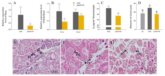 Effects of synthetic SpOT/VP-like peptide on gene expressions, E2 contents and ovarian development in vivo. (A) The relative expression level of Spvg in the hepatopancreas. (B) The relative expression level of Spvg and Spvgr in the ovary. (C) The content of E2 in the haemolymph. β-actin as the reference gene. (* p < 0.05; ** p < 0.01; one-way ANOVA followed by Dunnett’ s T tests; n = 5). (D–G) Histological changes of ovarian development. (D), diameter of oocytes; (E), initial control (IC); (F), negative control (CPS); (G), group injected with synthetic peptide. OC, oocytes; FC, follicular cells. (“a and b”, p < 0.05; “A and B”, p < 0.01; one-way ANOVA followed by Tukey’ s multiple range tests; n = 5).