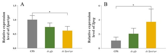 Effects of RNAi in the hepatopancreas explants in vitro. (A) Effects of RNAi with the application of Spot/vpr dsRNA. (B) Relative expression level of Spvg with the application of synthetic SpOT/VP-like peptide after RNAi. β-actin as the reference gene. (* p < 0.05; one-way ANOVA followed by Tukey’ s T tests; n = 5).