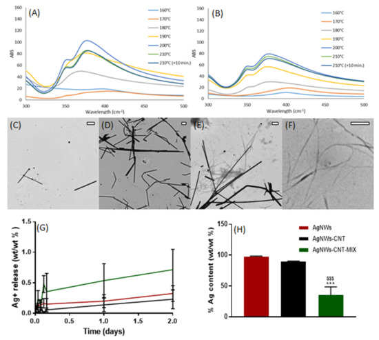 Physicochemical characterization of synthesized products. UV-spectra of (A) AgNWs and (B) of AgNWs-CNT at different temperatures during the synthesis reaction. TEM images of (C) AgNWs (scale bar 500 nm), (D) AgNWs-CNT (scale bar 500 nm), (E) AgNWs-CNT-mix (scale bar 500 nm) and (F) CNTs (scale bar 500 nm). (G) Silver release from AgNWs, AgNWs-CNT and AgNWs-CNT-mix measured by ICP-OES and expressed as wt/wt%. (H) Silver contents measured by ICP-OES in AgNWs, AgNWs-CNT and AgNWs-CNT-mix (n = 3). One-way ANOVA returned p < 0.05; Post-hoc Tukey’s multicomparison test, *** p = 0.001 when comparing all the formulations to AgNWs, and $$$ p = 0.003 when comparing AgNWs-CNT to AgNWs-CNT-mix.