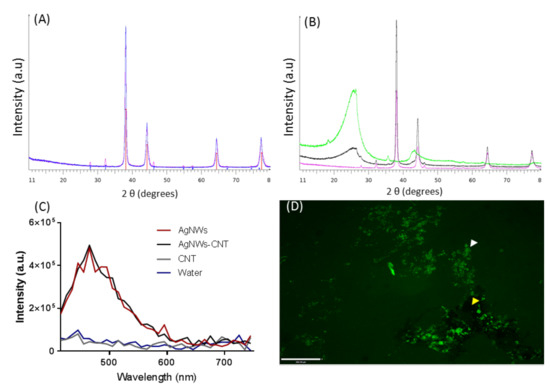 XRD pattern and fluorescence spectra. (A) XRD pattern of AgNWs (pink) and AgNWs-CNT (blue); red bars: Ag, PDF No. 04-0783; blue bars: AgCl, PDF n. 31-1238. (B) XRD pattern of AgNWs (violet), AgNWs-CNT-mix (black) and CNTs (green). (C) The emission fluorescence peaks of AgNWs (red), AgNWs-CNT-mix (black), CNTs (grey) and water (blue). (D) Fluorescence microscope image of AgNWs-CNT in water; the white arrow indicates AgNWs, and the yellow arrow indicates CNTs (scale bar 200 µm).