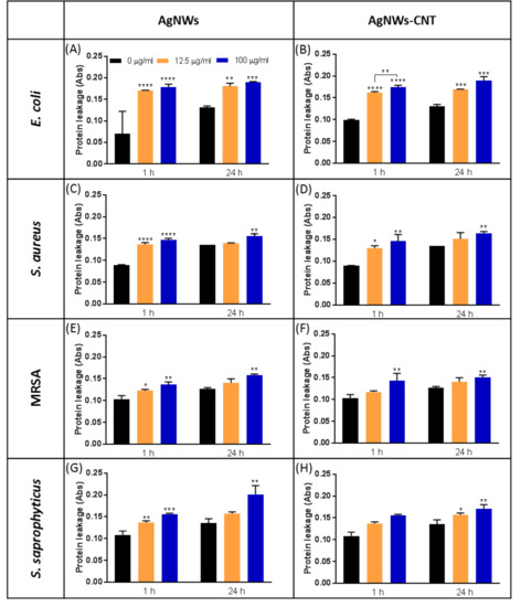 Cui and Liu reported that AgNWs could cause the leakage of cytoplasmic contents, such as DNA and proteins, from E. coli [11]. This phenomenon may be due to several alterations in bacterial cells, such as the inhibition of the activity of membranous enzymes or DNA damage. In the present study, a bicinchoninic acid (BCA) assay was used to determine whether AgNWs obtained by the two methods induced the release of proteins in the extracellular liquid. All the bacterial species tested showed an increased release of proteins in comparison to the control (Figure 4A–H). Moreover, this effect was dose-dependent, but no difference was found between 1 or 24 h after treatment, except for S. saprophyticus. A higher amount of proteins leaked out of E. coli compared to S. aureus and MRSA, suggesting that gram-negative bacteria are more sensitive than gram-positive bacteria to the action of AgNWs on the integrity of the membrane. This is justified by the barrier function of the thicker peptidoglycan found in gram-positive bacteria and is in agreement with previous studies [26]. No statistical difference was found between AgNWs and AgNWs-CNT, when comparing the same concentrations. SEM images confirmed the cell membrane damage caused by AgNWs, particularly in E. coli (Figure S8).